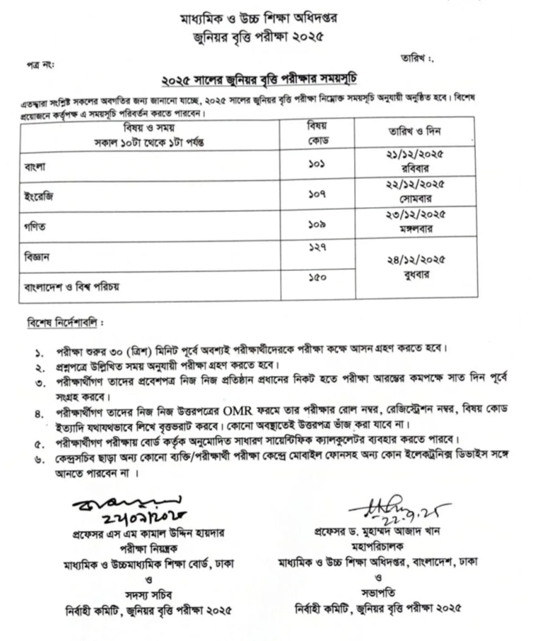 এর আগে, গত ১৪ সেপ্টেম্বর জুনিয়র বৃত্তি পরীক্ষার প্রশ্নপত্রের ধরন ও নম্বর বণ্টন প্রকাশ করেছে জাতীয় শিক্ষাক্রম ও পাঠ্যপুস্তক বোর্ড। এতে বলা হয়েছে, বাংলা, ইংরেজি, গণিত, বিজ্ঞান এবং বাংলাদেশ ও বিশ্ব পরিচয় বিষয়ে জুনিয়র বৃত্তি পরীক্ষা অনুষ্ঠিত হবে। বাংলা, ইংরেজি, গণিতে ১০০ করে, বিজ্ঞানে ৫০ এবং বাংলাদেশ ও বিশ্ব পরিচয়ে ৫০ নম্বর করে মোট ৪০০ নম্বরে পরীক্ষা হবে। প্রতিটি পরীক্ষার সময় ৩ ঘণ্টা।