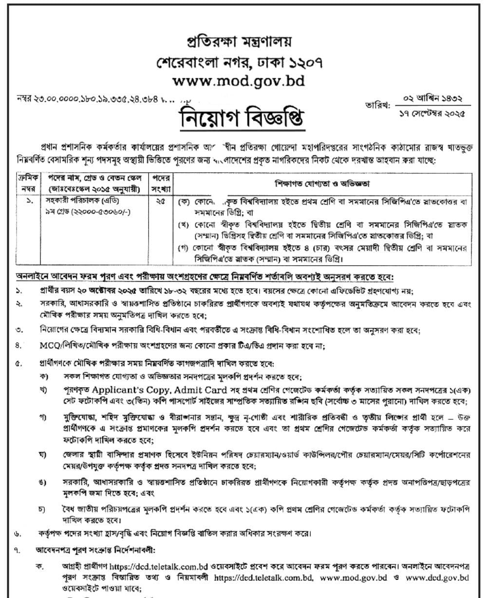 অনলাইনে আবেদনপত্র পূরণ সংক্রান্ত বিস্তারিত তথ্য ও নিয়মাবলী www.dcd.teletalk.com.bd, www.mod.gov.bd ও www.dcd.gov.bd ওয়েবসাইটে পাওয়া যাবে বলে বিজ্ঞপ্তিতে বলা হয়েছে।